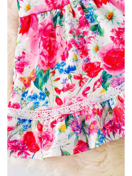 This beautiful toddler girls dress features a flare ruffle hem and exquisite embroidery, and features a floral print with peonies and daisies.